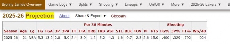 moreData website BBR predicts Bronny s new season statistics: 15.0 points, 5.2 rebounds and 4.3 assists per 36 minutes.