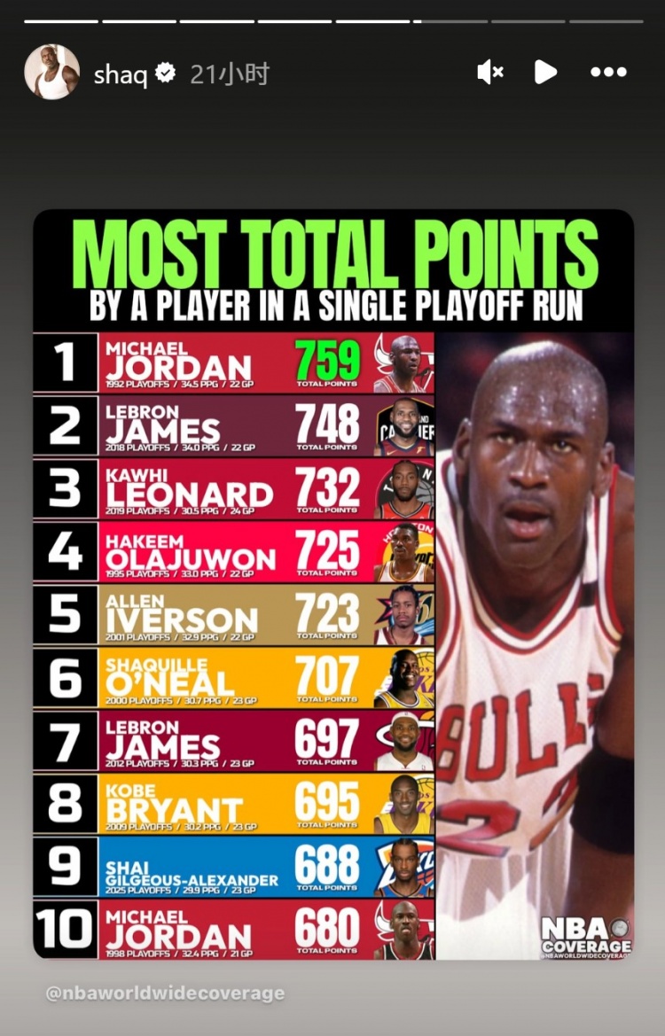 TianSports > Basketball > O Neal s total points in a single playoff game: 92 Jordan 759 points 1st 18 James 2nd 19 Cards 3rd SGA 9th