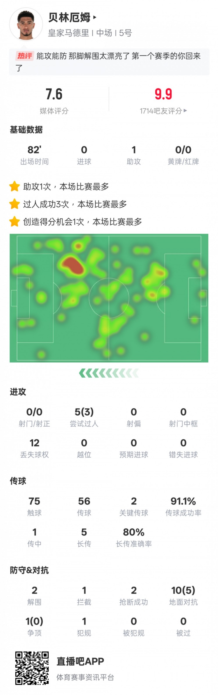 Bellingham s data in this game: 1 assist 3 out of the game and 2 key passes, rating 7.6