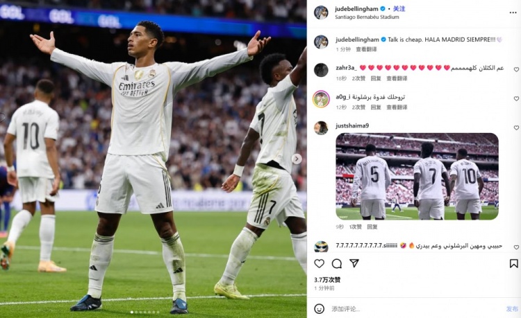 TianSports > Football > Fight back against Yamal! Bellingham scored a successful goal and posted domineering celebration photos on social media: Words are cheap