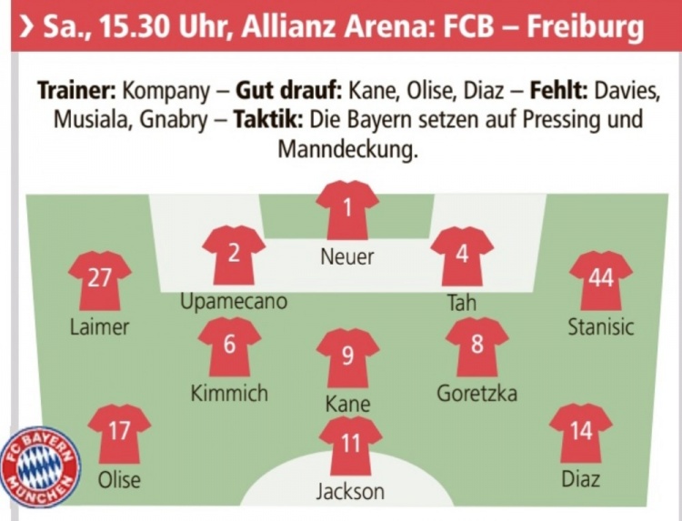 Neuer/Laimer, Upamecano, Jonathan Tower, Stanisic/Kimich, Goretzka/Olise, Kane, Dias/Jackson