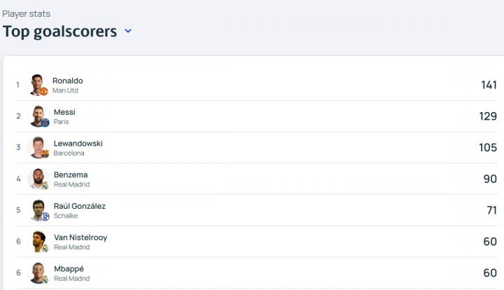 Next target Raul! Mbappe has scored 60 goals in the Champions League, ranking 6th in the Champions League history scorer list
