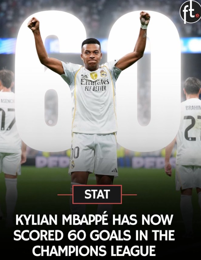 Real Madrid beat Keirat 5-0, and Mbappe scored a hat trick. So far, 26-year-old Mbappe has scored 60 goals in the Champions League, ranking 6th in the Champions League history scorer list.