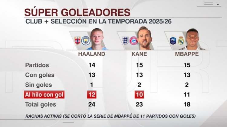 ESPN counted the club + national team data of Haaland, Kane, and Mbappe this season and made comparisons.