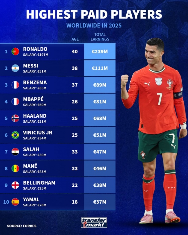 Ranking of player income in 2025: Cristiano Ronaldo leads the way with 239 million euros, followed by Messi with 111 million euros