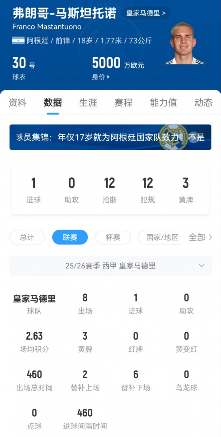 This summer Real Madrid signed 18-year-old Mastantuono for 45 million euros. He has played 8 times in the league for Real Madrid and contributed 1 goal. His current value is 50 million euros.