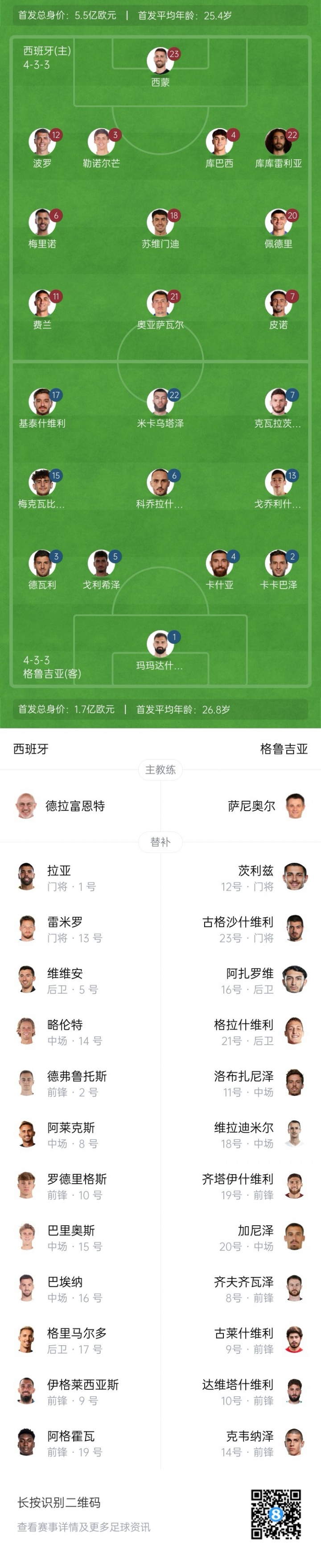 TianSports > Football > Spain vs Georgia starting lineup: Pedri, Ferran, Merino start, K77 plays
