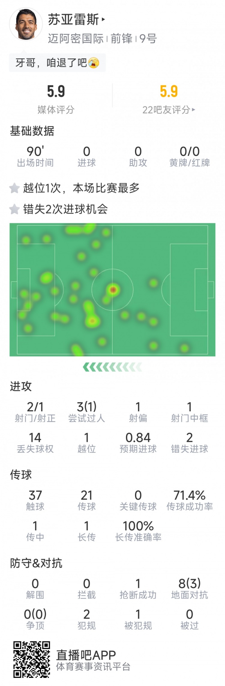 TianSports > Football > Suarez s statistics for this game: 2 missed opportunities, 1 goal, and the lowest rating of 5.9 points in the game