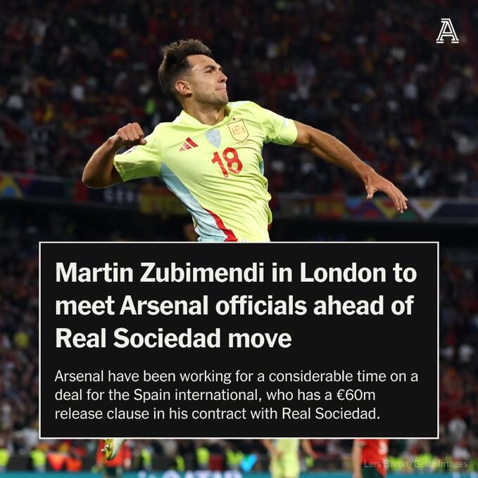 According to The Athletic, Real Sociedad midfielder Zubimendi has arrived in London to complete the transfer to Arsenal.